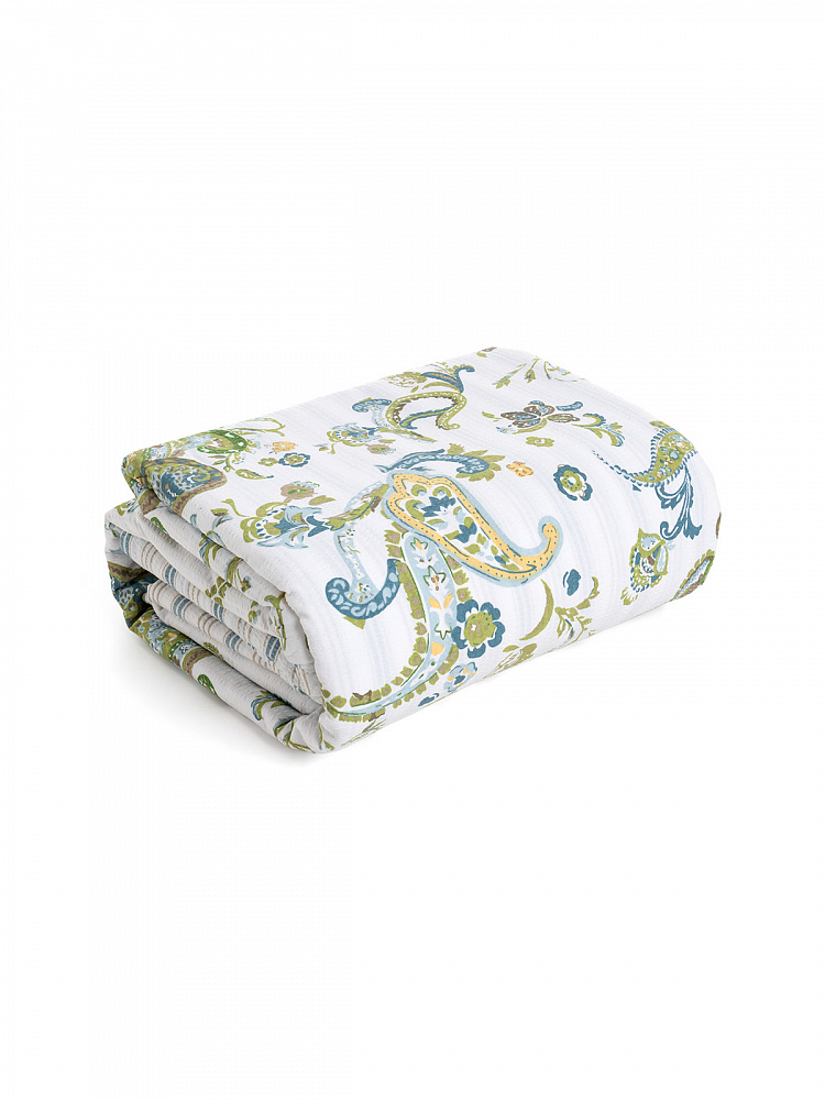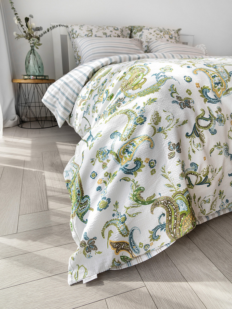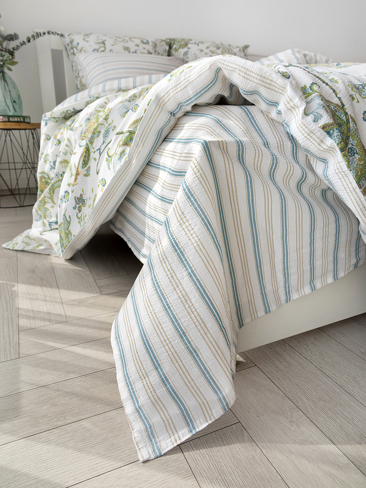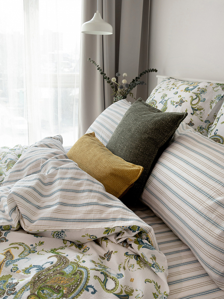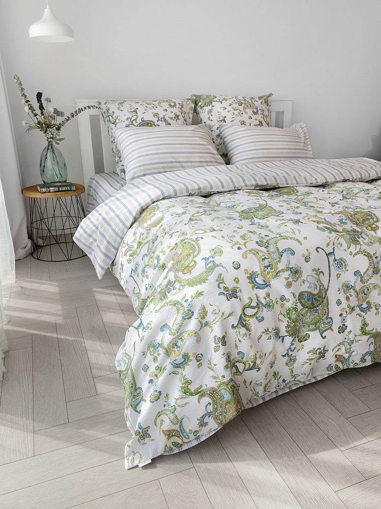 Комплект постельного бельяЕвроDE'NASTIA(пододеяльник200х220простыня230х260наволочки50x70см2шт70х70см2шт)BotehОгурцыПолоскаБелыйЗеленыйСинийЖатыйХлопок