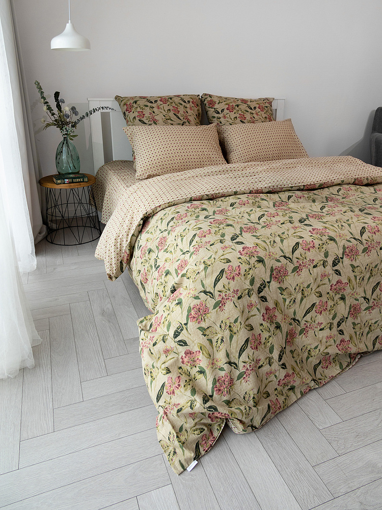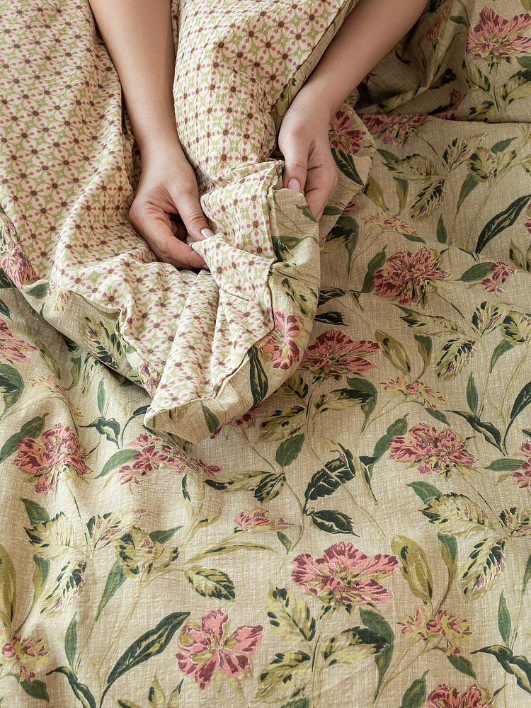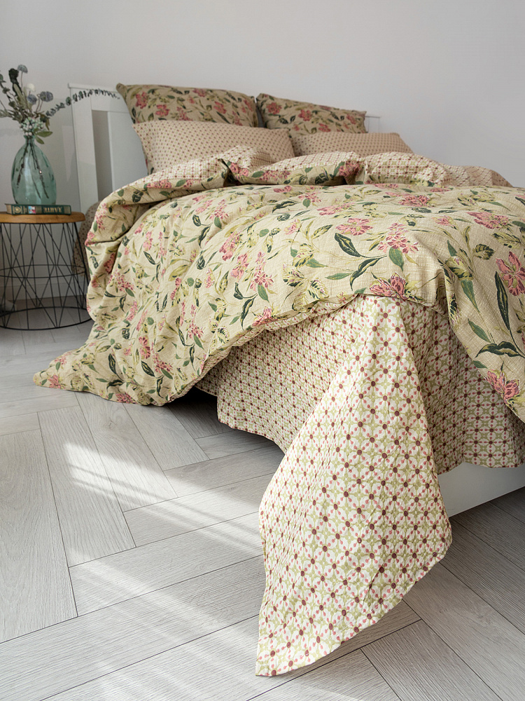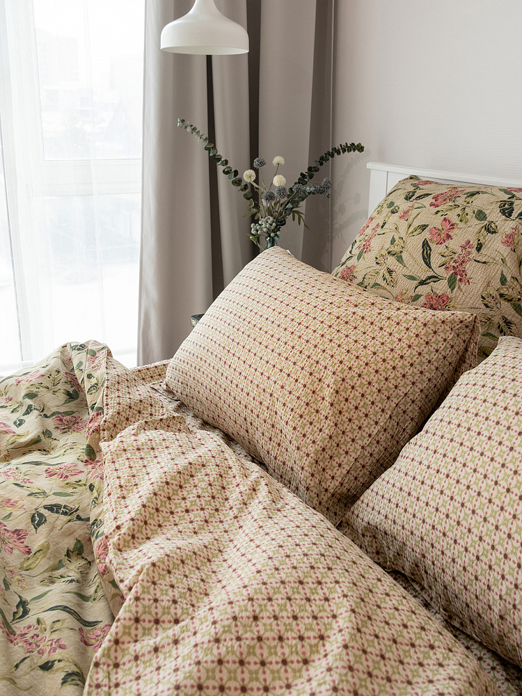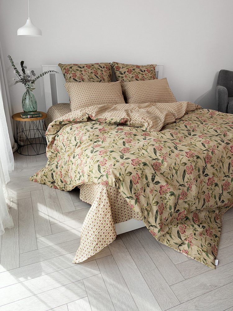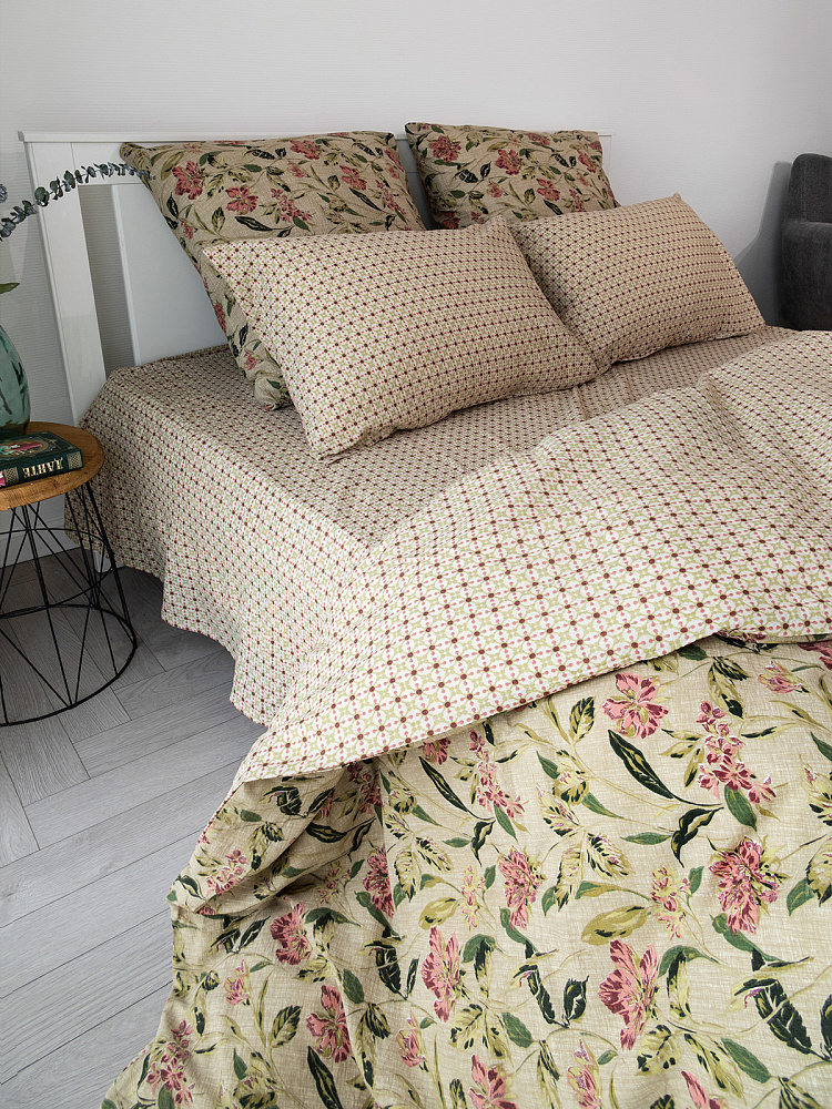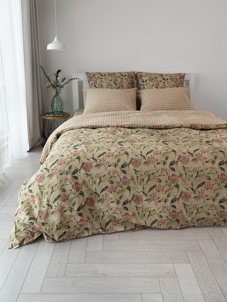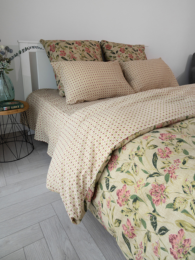 КомплектПостельногоБельяЕвроDE'NASTIA(пододеяльник200х220Простыня230х260Наволочки50x70см2шт70х70см2шт)VisionЦветыОрнаментЗеленыйТемноРозовыйЖатыйХлопо