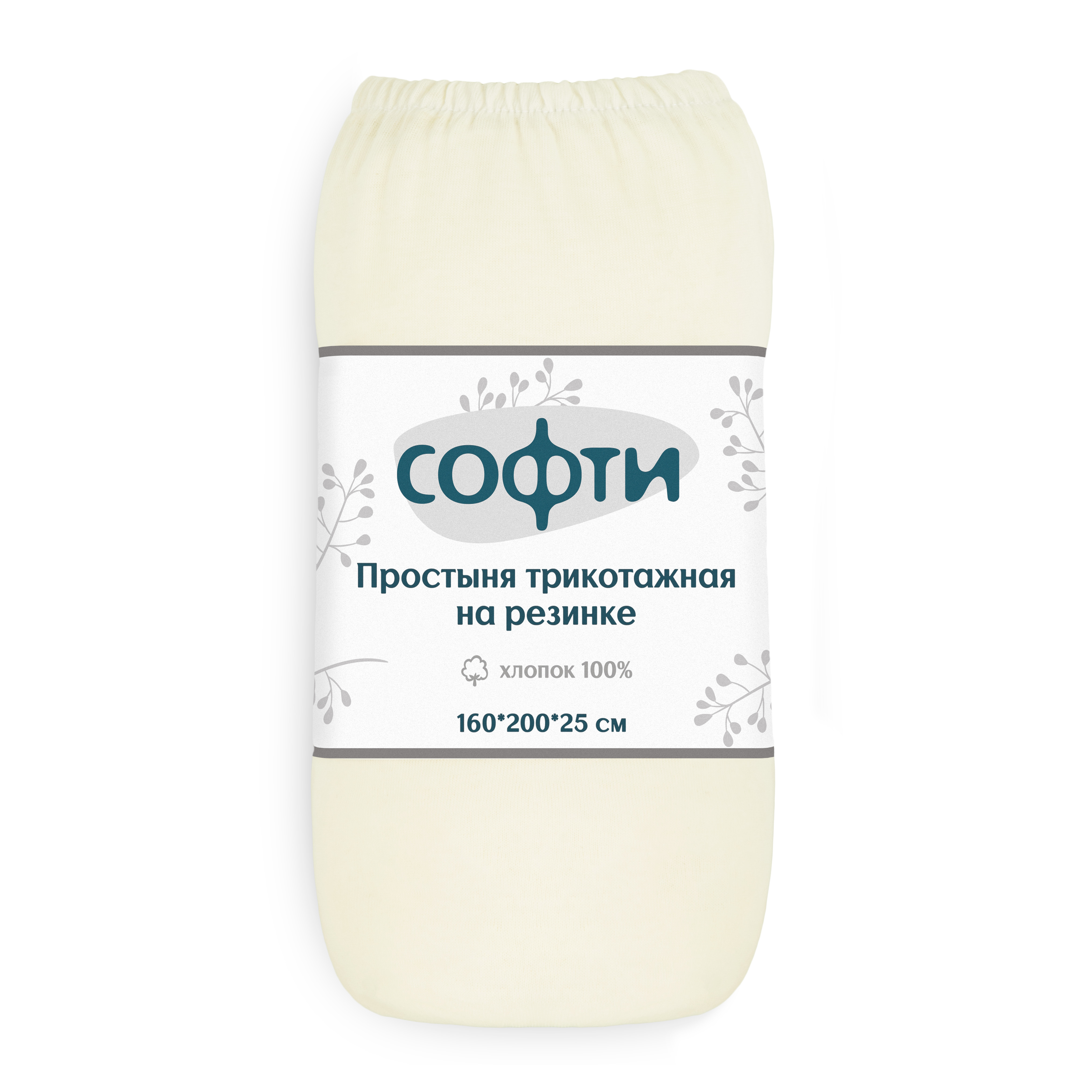 Простыня трикотажная на резинке 160х200х25см СОФТИ с бурлетами 25см упаковка-ролик плотность 120гр/м2 молочная хлопок 100%