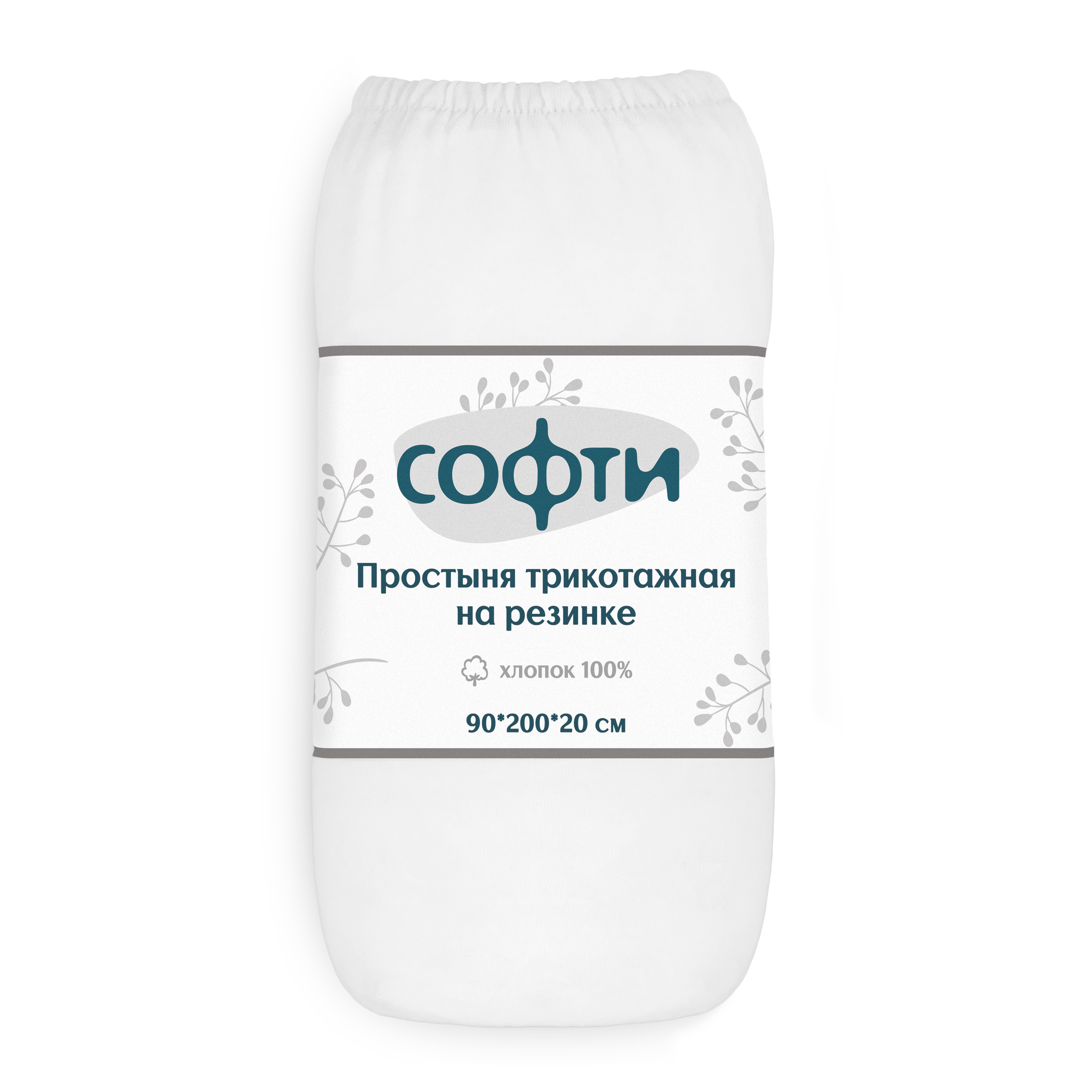 Простыня трикотажная на резинке 90х200х20см СОФТИ с бурлетами 25см упаковка-ролик плотность 120гр/м2 белая хлопок 100%