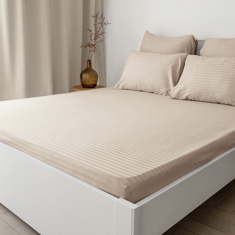 Проcтыня на резинке 90x200+25см DE'NASTIA бежевый страйп-сатин 1см хлопок 100%