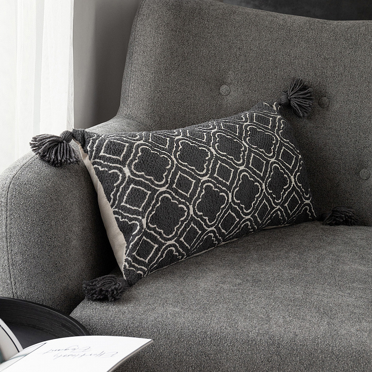 Подушка декоративная 30х60см DE'NASTIA тафтинг барокко на молнии с кисточками графит полиэстер/хлопок/вискоза