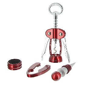 Набор для вина Fackelmann включает в себя штопор с рычагами, пробку, насадку с режущей кромкой и кольцо на горлышко. Штопор с рычагами выполнен из нержавеющей стали и пластика. Он поможет легко и быстро вывернуть пробку из любой бутылки. Пробка из металла и пластика с силиконовой прослойкой надежно закупоривает бутылку и не позволяет напитку выдохнуться. Насадка с режущей кромкой из пластика и стали поможет быстро обрезать фольгу. Кольцо для вина, надевающееся на горлышко бутылки, сделано из пластика и войлока. Такой набор станет уместным подарком для ценителей вин. Предметы набора не рекомендуется мыть в посудомоечной машине. Немецкая компания Fackelmann – это воплощение практичной, качественной и доступной продукции для кухни и домашнего хозяйства.