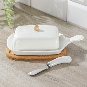 Масленка 22х13х7см ДОЛЯНА Эстет на деревянной подставке с ножом белый фарфор