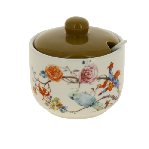 Великолепная сахарница Matissa Райский сад, выполненная из высококачественной керамики (доломит), оформлена ярким изображением. К сахарнице прилагается крышка и оригинальная ложка. Сахарница универсальна, подойдет не только для сахара, но и для меда, варенья, и для специй. Эксклюзивный дизайн и функциональность сахарницы сделает ее незаменимой на любой кухне. Объем сахарницы: 430 мл.