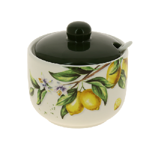 Великолепная сахарница Matissa Лимоны, выполненная из высококачественной керамики (доломит), оформлена ярким изображением. К сахарнице прилагается крышка и оригинальная ложка. Сахарница универсальна, подойдет не только для сахара, но и для меда, варенья, и для специй. Эксклюзивный дизайн и функциональность сахарницы сделает ее незаменимой на любой кухне. Объем сахарницы: 430 мл.