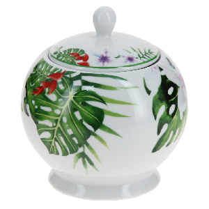 Сахарница Фламинго МФК-ПРОФИТ объёмом 560мл имеет чашеобразную округлую форму и выполнена из фаянса высокого качества, стойкого к запахам. На белой поверхности сахарницы нанесен яркий и долговечный принт тропических листьев и цветов. Сахарница имееткрышку, которая предохраняет сахар от влаги и пыли. В сахарнице возможно хранить как сахарный песок, так и кусковой (колотый или пилёный) а также леденцовый сахар. Наполните свой мир яркими тропическими красками! Подходит для мытья в посудомоечноймашине.
