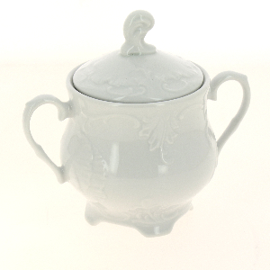 Элегантная сахарница Cmielow Rococo с крышкой. Изготовлена из высококачественного фарфора, выполнена в элегантном стиле с рельефным орнаментом на борту и позолотой на ободке. Фарфоровая посуда очень удобна и долговечна. Великолепно будет смотреться при сервировке стола.