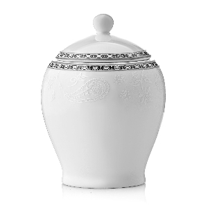 Сахарница 350 мл из костяного фарфора. Конусообразная форма изделия. Рисунок Пейсли. Цвет белый. Разрешено использовать в посудомоечной машине и в микроволновой печи. Гарантия 1,5 года.