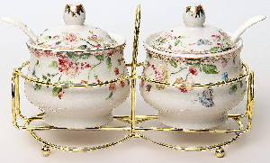 СТЕФАНИЯ, набор 2 сахарницы 300мл с ложками на метал.подставке, NEW BONE CHINA, цветная упаковка