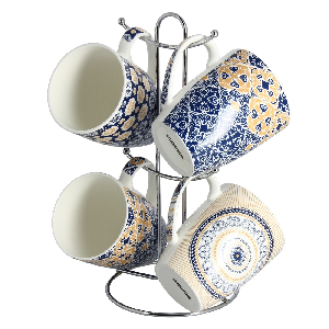 Набор кружек Мадрид Estetica, 360мл состоит из 4 кружек и подставки, на которую кружки подвешиваются. Кружки выполнены из белого фарфора по итальянскому дизайну. Фарфоровая посуда отличается белизной, прочностью и легкостью. Краски декора безопасны для приема пищи. Подходит для ежедневного использования. Красивый и необычный дизайн кружки напоминает узоры испанских фресок. Пить чай или кофе из такой кружки, разглядывая узоры, особенно приятно и тепло. Пригодны для мытья в посудомоечной машине. Высота кружки – 10 см.