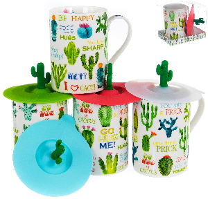 ВРЕМЯ ПОДАРКОВ - ВРЕМЯ ЧУДЕС! кружка 310мл с силикон.крышкой, NEW BONE CHINA, 4 вида декора - КАКТУС, подарочная упаковка PVC