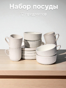 Набор столовой посуды 12 предметов (тарелка обеденная 26см-4шт/салатник 15см-4шт/кружка 480мл-4шт)