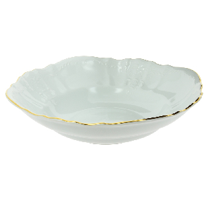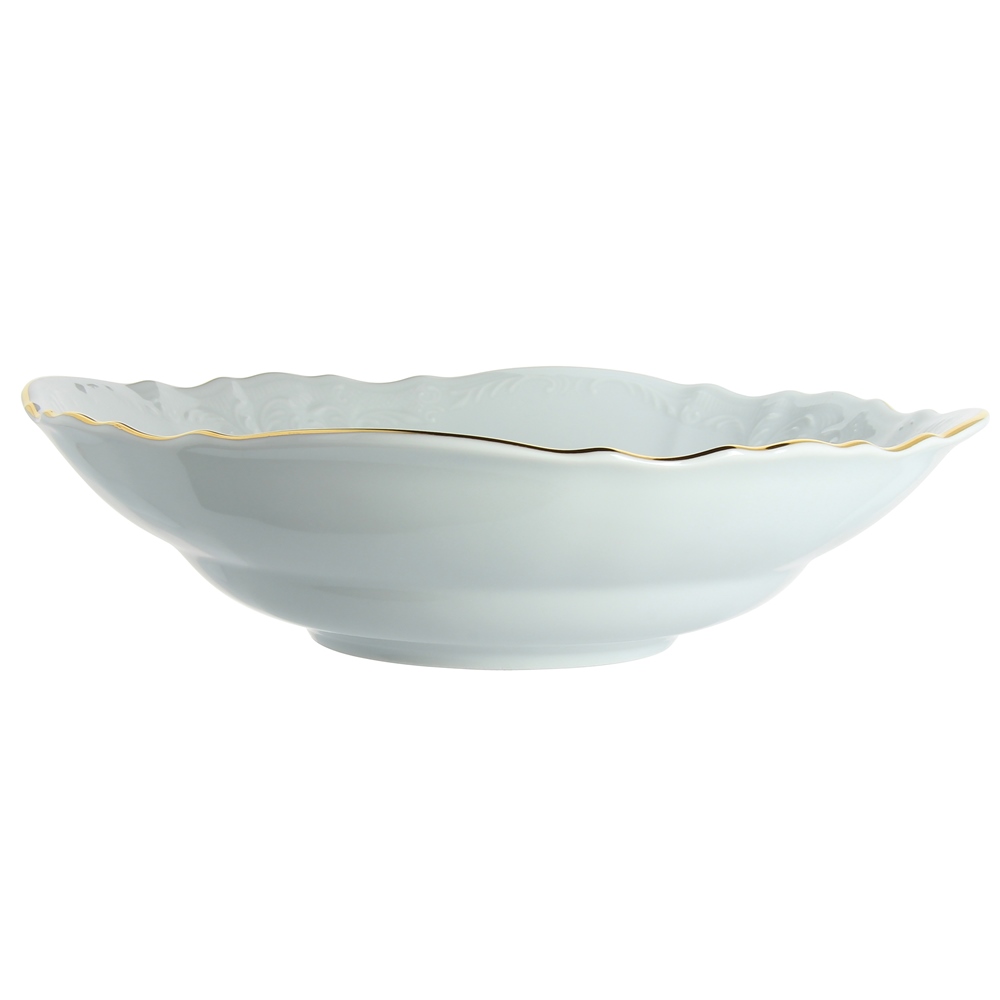 Салатник отводка Золото Люкс Хауз, 25 см выполнен из чешского жаропрочного фарфора. Торговая марка Bohemia на протяжении несколькихстолетий известна во многих странах мира как производитель эксклюзивной и удивительно красивой посуды. Высокое качество посуды с узором и утолщенным краем, повышающим прочность фарфора, - вот только некоторые причины, по которым посуда Bernadotte украшает столы первых лиц государства. Салатник позволит красиво подать салат и сделает даже обычный ужин праздничным!