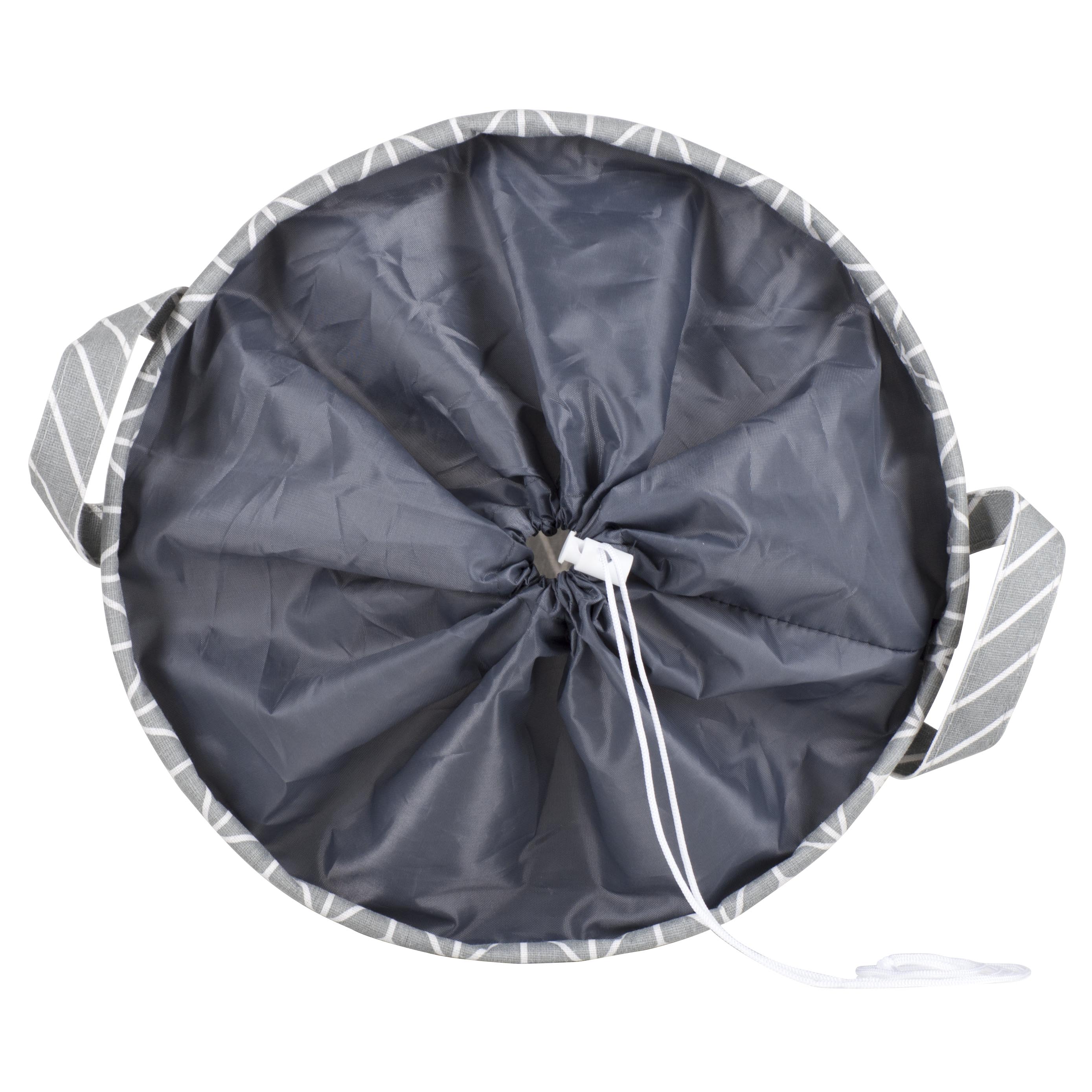 Корзина для хранения цилиндрической формы из прочного полиэстера, размер диаметр 35см, высота 55см. Верхняя часть из более тонкого материала, завязывается на кулиску. Две ручки, внутри металлическая вставка для устойчивости. Состав (материал): полиэстер, металл, пластик.