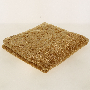 Махровое полотенце выполнено из натуральной хлопковой пряжи. Пушистое полотно охристо-бежевого цвета декорировано широким бордюром с объемным растительным узором. Рисунок передан стрижеными петлями разной высоты и ткацким переплетением, при котором длинные нити располагаются на обратной стороне полотна. Изделие средней плотности долго сохраняет насыщенность цвета и мягкость, не дает усадки даже после многократных стирок. Махровое полотенце деликатно ухаживает за кожей лица, повышая ее тургор.