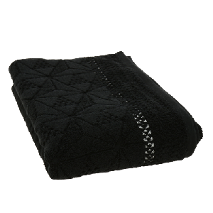 Полотенце для душа выполнено в черном цвете из премиальной пряжи Long Twist. Ее мягкие махровые петли позволяют долго сохранять рельеф. Основное полотно украшено бордюром из геометрических фигур и декорировано серебряной дорожкой из полиэфирной нити. Рисунок передан разной высотой петли и ткацким переплетением, при котором ворсинки располагаются на обратной стороне ткани.