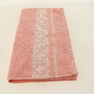 Махровое полотенце розового персиково-кораллового цвета выполнено из натуральной хлопковой пряжи. Пушистое полотно декорировано двойным бордюром в виде растительного орнамента из лилий и утонченной ленты из ромбов. Композиция выполнена серебряной полиэфирной нитью. Изделие сохраняет насыщенность цвета, мягкость и первоначальный размер даже после многократных стирок. Махровое полотенце деликатно ухаживает за кожей лица, повышая ее тургор.