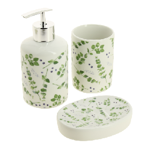 Ванную комнату мы посещаем по несколько раз в день. Поэтому хочется, чтобы она была уютной, стильной и заряжала по утрам бодростью и хорошим настроением. Секрет её удачного оформления - яркие аксессуары. Набор предметов ДОЛЯНА Эвкалипт для ванной не только внесёт изюминку в интерьер, но и значительно облегчит хранение некоторых принадлежностей. Изделия устойчивы к резким перепадам температуры и высокой влажности. Также стоит отметить качество аксессуаров - набор при правильном уходе прослужит вам очень долго.
